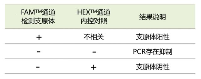 FAM通道:檢測(cè)支原體熒光信號(hào)。HEX通道:檢測(cè)內(nèi)控對(duì)照熒光信號(hào)。
