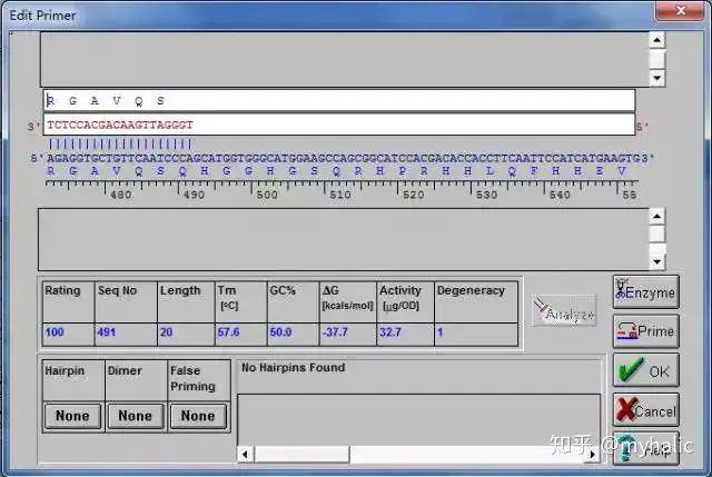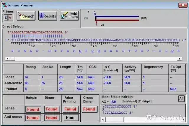 分別代表的是正向和反向引物。該圖中間部分給出了引物的得分,位置,長(zhǎng)度,Tm值,GC含量,自由能等信息。該圖最下面的模塊給出了正反引物是否形成發(fā)夾結(jié)構(gòu),二聚體,錯(cuò)配以及引物之間的二聚體等情況,紅色代表有。