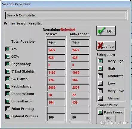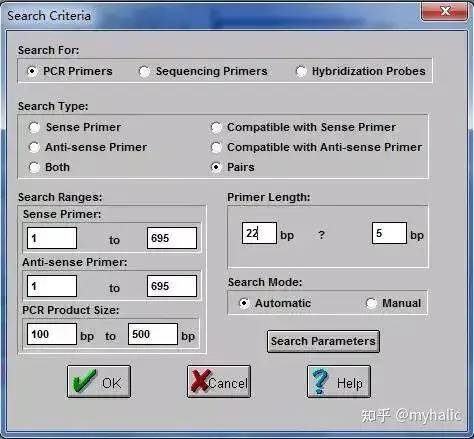 第三個(gè)地方是正負(fù)鏈的所在區(qū)間以及產(chǎn)物的大小長(zhǎng)度,這個(gè)按自己的需要來(lái),跟實(shí)驗(yàn)?zāi)康挠嘘P(guān),具體情況具體分析。第四個(gè)地方是引物的長(zhǎng)度以及正負(fù)波動(dòng)值,一般來(lái)說(shuō)引物長(zhǎng)度在18-27范圍內(nèi)。第五個(gè)地方是選擇模式,一般選“Automatic”。設(shè)置完上面所說(shuō)的這些地方后按“OK”鍵,則跳轉(zhuǎn)到新界面。