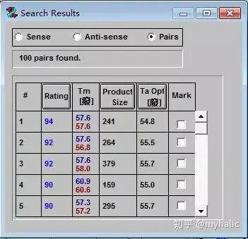 顯示結(jié)果按照評(píng)估分?jǐn)?shù)從高到低向下排列, 一般選取評(píng)估分?jǐn)?shù)較高的結(jié)果。打分是衡量引物質(zhì)量的綜合性參數(shù),利用打分系統(tǒng)可以對(duì)引物進(jìn)行有效評(píng)估和引物間進(jìn)行對(duì)比選擇提供有效的證據(jù)。如果我們只想要尋找正向或反向的引物,就可以選擇“Sense”或“Anti-sense”按鈕。
