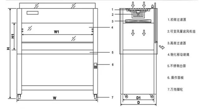 垂直送風(fēng)的超凈工作臺:潔凈風(fēng)是從超凈的上部自上而下吹下來的,有玻璃窗隔離。