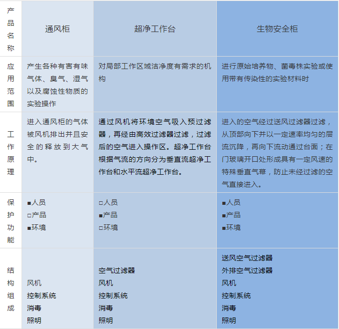 | 產(chǎn)品名稱 | 通風(fēng)柜 | 超凈工作臺 | 生物安全柜 |