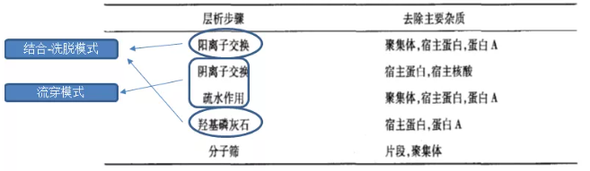 精純步驟常用的方法包括陰離子交換層析、陽離子交換層析、疏水作用層析、羥基磷灰石層析和分子篩,其中陰離子交換和疏水作用采用流穿模式,陽離子交換和羥基憐灰石采用結(jié)合-洗脫模式。各個(gè)層析步驟的主要雜質(zhì)去除能力見表。